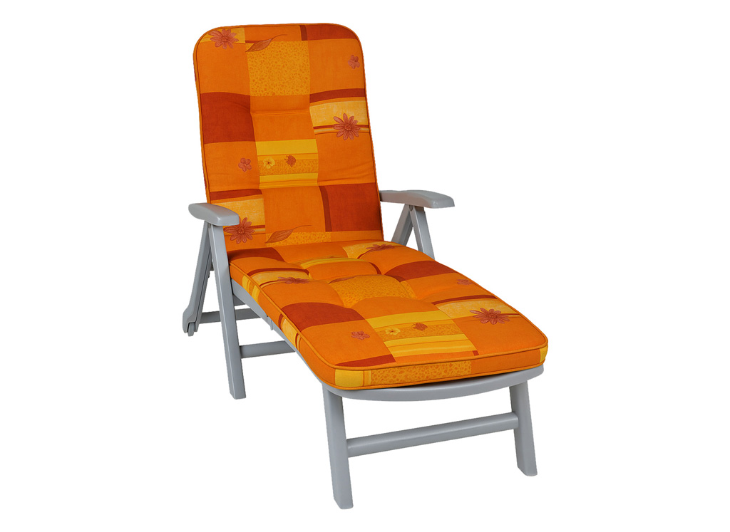 Das Design der Liegenauflage Toledo terra, besteht aus aneinandergereihten Quadraten, in unterschiedlichen Farben. Besonders dominant sind dabei die Orangetöne. Zudem befinden sich bordeauxrote und auch hellgelbe Parts im Design. Vereinzelt befinden sich Blüten auf den Polstern, die dem sommerlichen Look eine verspielte Leichtigkeit verleihen.